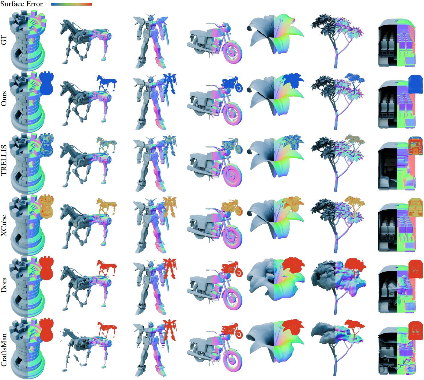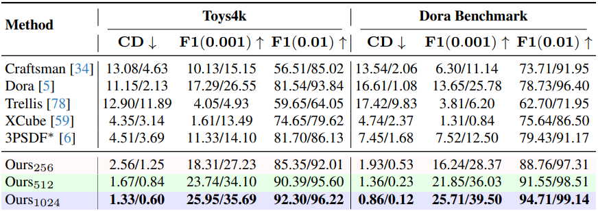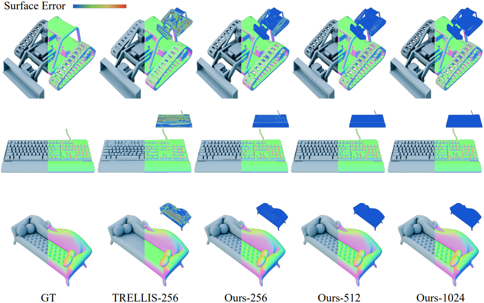 렌더링 loss를 활용하여 SparseFlex VAE를 end-to-end로 학습시키고, SparseFlex 표현의 미분 가능성과 frustum-aware sectional voxel training이라는 새로운 학습 전략을 활용한다. 이 전략은 학습 중 메모리 소비를 획기적으로 줄여 기존 방식으로는 불가능했던 고해상도(최대 $1024^3$)를 구현할 수 있게 해준다.