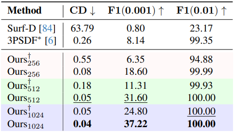 다음은 열린 표면 데이터셋인 Deepfashion3D에서 재구성 품질을 비교한 결과이다. ($\vphantom{1}^\dagger$는 self-pruning 업샘플링 모듈을 사용하지 않은 모델)