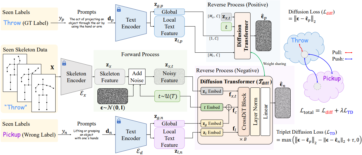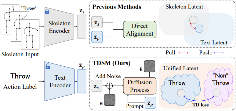 Diffusion model의 컨디셔닝 메커니즘은 정확한 cross-modal 정렬을 가능하게 하여 생성된 출력이 주어진 조건에 충실하게 부합하도록 한다. 이러한 특성에 착안하여, 본 논문에서는 diffusion model을 ZSAR에 적용하고 텍스트 프롬프트를 기반으로 denoising process를 컨디셔닝하는 새로운 프레임워크인 Triplet Diffusion for Skeleton-Prompt Matching (TDSM)을 제안하였다. 본 접근 방식은 reverse process를 활용하여 공유된 latent space 내에서 스켈레톤 feature와 텍스트 feature를 암시적으로 정렬함으로써, 직접적인 feature space 정렬의 어려움을 극복한다.