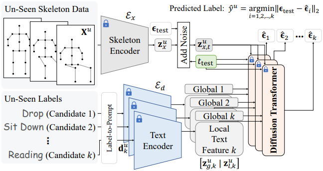Inference 시에는 각 미지의 스켈레톤 시퀀스 \(\textbf{X}_u\)와 모든 후보 텍스트 프롬프트가 TDSM에 입력되고, 모든 후보 텍스트 프롬프트에 대한 결과 noise는 고정된 GT noise \(\epsilon_\textrm{test} \sim \mathcal{N}(0,I)\)와 비교된다. \(\textbf{X}_u\)는 먼저 \(\mathcal{E}_x\)를 통해 다음과 같이 스켈레톤 latent space로 인코딩된다.