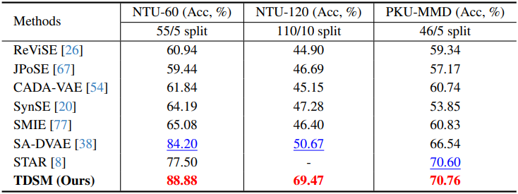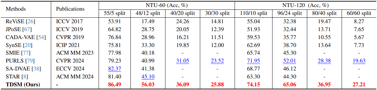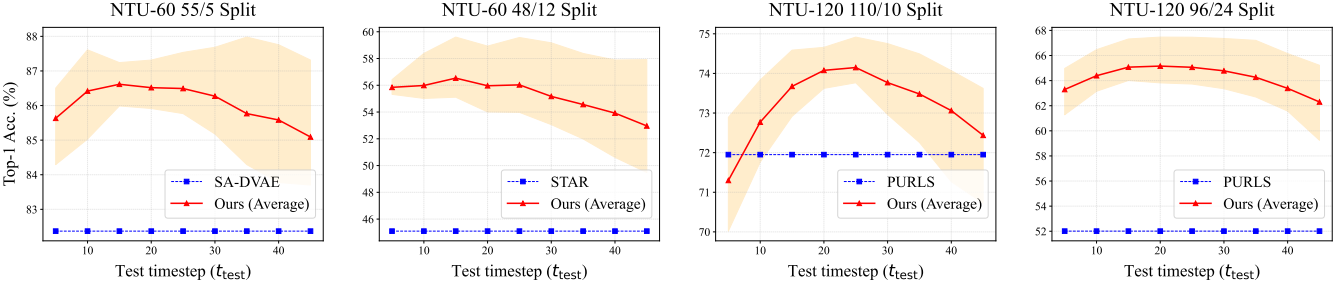 \[\begin{equation} \hat{y}^u = \underset{k}{\arg \min} \| \epsilon_\textrm{test} - \hat{\epsilon}_k \|_2 \end{equation}\]이 과정을 통해 모델은 텍스트 프롬프트가 스켈레톤 시퀀스와 잘 일치하는 동작 레이블을 선택하게 되므로, 이전에 보지 못한 동작 레이블이 있는 스켈레톤 시퀀스에 대해서도 정확한 zero-shot 인식이 가능하다. 샘플을 반복적으로 개선하는 생성 모델과 달리, 본 논문에서 제시하는 TDSM은 고정된 timestep으로 한 번의 inference를 수행하므로 효율적이며 판별적인 스켈레톤-텍스트 정렬에 매우 적합하다.