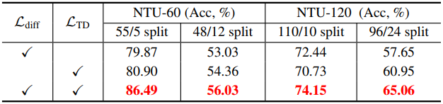 \(\mathcal{L}_\textrm{TD}\)는 간단하지만 매우 효과적이며, $\epsilon$과 \(\hat{epsilon}_p\) 사이의 거리를 최소화하는 동시에 \(\hat{\epsilon}_n\)에 대한 거리를 최대화하도록 유도하여 학습된 스켈레톤-텍스트 latent space에서 두 가지 모달리티의 판별적인 융합을 보장한다.