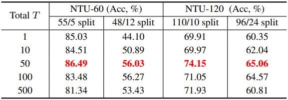 다음은 총 timestep 수 $T$에 대한 ablation study 결과이다.