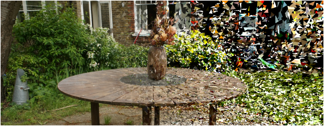 고밀도 영역에서는 각 픽셀에서 많은 삼각형이 겹쳐지므로 각 도형이 더 높은 $\sigma$ 값을 가지게 되어 더 부드러운 결과물을 얻을 수 있다. 반대로 저밀도 영역에서는 픽셀에 영향을 미치는 삼각형의 수가 적기 때문에 각 삼각형이 재구성 과정에 더 많은 기여를 해야 한다. 결과적으로 각 삼각형은 내부 영역에 걸쳐 기여도를 높이기 위해 더 낮은 $\sigma$ 값을 가지게 되며, 이를 통해 기하학적 경계 내에서 최대한의 영역을 커버하여 더욱 선명한 결과물을 만들어낸다.