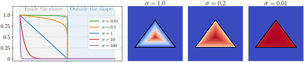 $I$는 삼각형 내심에서 1, 경계에서 0, 삼각형 외부에서 0이 된다. $\sigma > 0$는 삼각형의 내심과 경계 사이의 전환을 제어하는 smoothness 파라미터이다. 이 공식은 세 가지 중요한 성질을 가지고 있다.