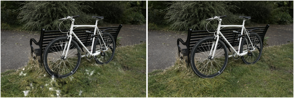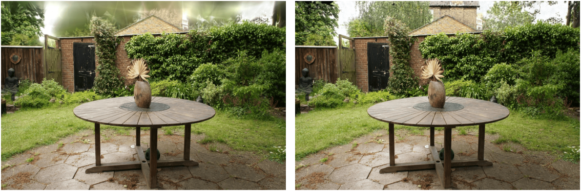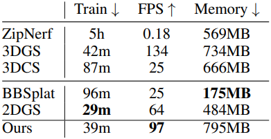 \[\begin{equation} \mathcal{L} = (1 - \lambda) \mathcal{L}_1 + \lambda \mathcal{L}_\textrm{D-SSIM} + \beta_1 \mathcal{L}_o + \beta_2 \mathcal{L}_d + \beta_3 \mathcal{L}_n + \beta_4 \mathcal{L}_s \end{equation}\]Experiments