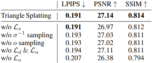 학습 loss는 photometric loss (\(\mathcal{L}_1\), \(\mathcal{L}_\textrm{D-SSIM}\)), 3DGS-MCMC의 opacity loss \(\mathcal{L}_o\), 2DGS의 distortion loss \(\mathcal{L}_d\) 및 normal loss \(\mathcal{L}_n\)의 결합이다. 또한, 더 큰 삼각형을 유도하기 위해 크기 정규화 항