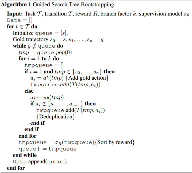 구조화된 task에는 TSLM이 직접 학습할 수 있는 미리 정의된 탐색 트리가 있지만, 대부분의 실제 task에는 명시적인 트리 구조가 부족하여 정답 또는 정답 경로만 제공된다. 본 논문에서는 모델이 생성한 탐색과 알려진 solution을 결합하여 합성 학습 트리를 구축하는 간단한 부트스트래핑 방법을 채택하였다.