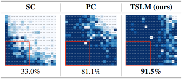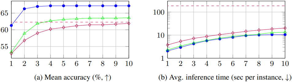 다음은 (a) 평균 정확도와 (b) 평균 inference 시간을 비교한 결과이다. (SC가 빨간색, PC가 초록색, TSLM이 파란색)