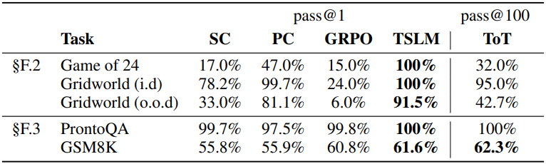 \[\begin{equation} \mathcal{L} = -\sum_{t=1}^T \log p (y_t \vert y_{<t}, x) \end{equation}\]여기서 $y_t$는 추론 내용과 구조적 토큰을 모두 포함한다. 이 cross entropy loss는 표준적이지 않은 학습 신호를 사용한다. 각 토큰이 prefix에만 의존하는 순차적 모델링과 달리, TSLM 토큰은 트리 구조에 의존한다. 예를 들어, action $a_i$는 $T(s, a_i)$가 확장 가능한지, 그리고 $a_1, \cdots, a_{i-1}$과 다른지에 따라 컨디셔닝된다. 이러한 구조적 컨디셔닝은 모델에게 다음과 같은 것을 학습시킨다.