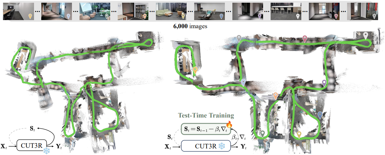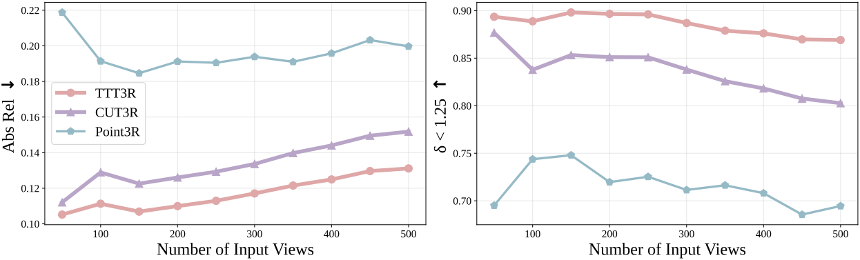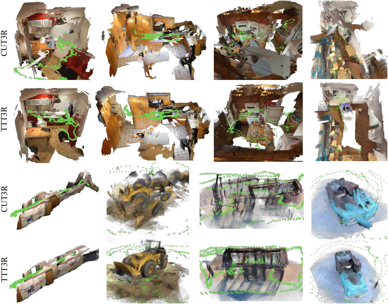 또한, 저자들은 CUT3R가 TTT 메커니즘으로 해석될 수 있는 반면, 학습 중 시퀀스 길이를 단순히 늘리는 것은 FLOP 활용도가 매우 낮음을 발견했다. 따라서 CUT3R에서의 온라인 associative recall을 위하여, closed-form state transition으로 유도된 TTT3R이라는 간단하면서도 효과적인 inference-time state 업데이트 규칙을 제안하였다. 이 transition은 test-time에 state를 업데이트하는 데 필요한 learning rate를 명시적으로 정의하여 길이 일반화를 가능하게 한다. 본 접근법은 내부 신뢰도 신호를 활용하여 저품질 state 업데이트를 선택적으로 억제한다. 이를 통해 fine-tuning이나 추가 파라미터 없이도 catastrophic forgetting을 완화하는 안정적이고 학습이 필요 없는 gating 메커니즘을 제공한다.