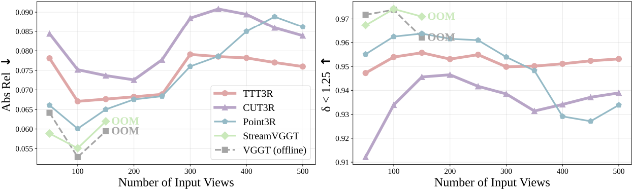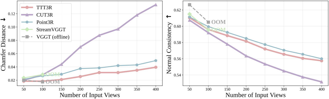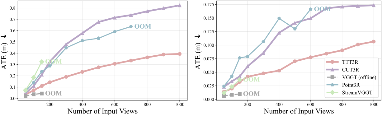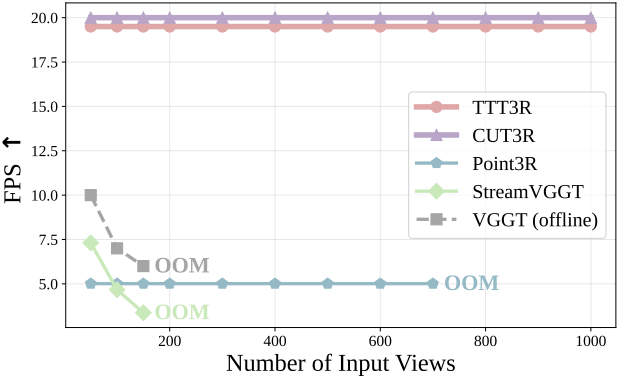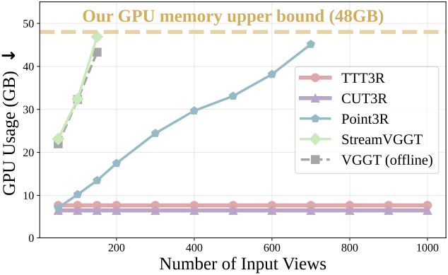3D reconstruction foundation model은 입력 RGB 이미지 세트로부터 카메라 포즈와 장면 표현을 예측하는 것을 목표로 한다. 실제로는 임의의 개수의 이미지를 처리해야 하며, 최근의 feedforward 방식(ex. VGGT, Point3R)은 높은 메모리 소비라는 문제점을 안고 있다. 특히, RNN 기반 설계에서 일정한 메모리 사용량을 달성하는 것은 CUT3R뿐이다. 그러나 CUT3R는 대부분의 64프레임 시퀀스를 학습하기 때문에 긴 시퀀스로 일반화하는 데 실패한다.