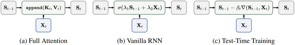 Test-Time Training (TTT)은 학습과 inference 과정에서 동적으로 컨텍스트를 포착하기 위해 업데이트되는 빠르게 적응 가능한 state인 fast weight를 도입한다. 반면, slow weight, 즉 모델 파라미터는 inference 과정에서 고정된 상태를 유지한다. TTT는 state를 고정 길이의 fast weight \(\textbf{S}_{t-1} \in \mathbb{R}^{n \times c}\)로 표현하고 gradient descent를 통해 업데이트한다.