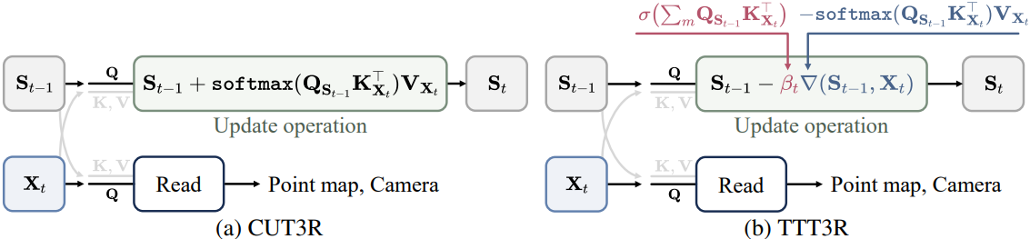 \[\begin{equation} \textbf{S}_{t-1} + \textrm{softmax}(\textbf{Q}_{\textbf{S}_{t-1}} \textbf{K}_{\textbf{X}_t}^\top) \textbf{V}_{\textbf{X}_t} = \textbf{S}_{t-1} - \beta_t \nabla (\textbf{S}_{t-1}, \textbf{X}_t) \\ \Rightarrow \quad \beta_t = 1, \quad \nabla (\textbf{S}_{t-1}, \textbf{X}_t) = -\textrm{softmax}(\textbf{Q}_{\textbf{S}_{t-1}} \textbf{K}_{\textbf{X}_t}^\top) \textbf{V}_{\textbf{X}_t} \end{equation}\]그러나 softmax 연산은 모델이 최신 관측값에 완전히 적응하도록 강제하기 때문에 CUT3R가 과거 정보를 유지하는 것과 새로운 입력을 통합하는 것 사이의 균형을 맞추는 데 한계가 있다. 특히, softmax 가중치는 관측값 토큰 차원을 따라 합이 1.0이 되도록 정규화되기 때문에, 모델은 항상 과거 상태 \(\textbf{S}_{t-1}\)보다 새로운 정보 \(\textbf{X}_t\)를 우선시하여 catastrophic forgetting을 초래한다.