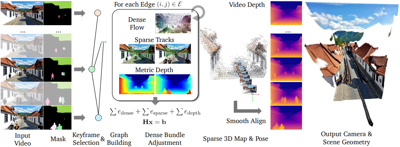 ViPE의 파이프라인은 키프레임 기반 SLAM 시스템을 기반으로 하여 임의 길이의 동영상에 대한 scalability와 robustness를 향상시켰다. 일반적으로 대부분의 키프레임 기반 시스템과 동일한 프런트엔드 및 백엔드 설계를 따르며, 다음과 같은 단계들로 구성된다.