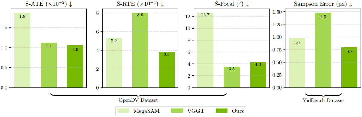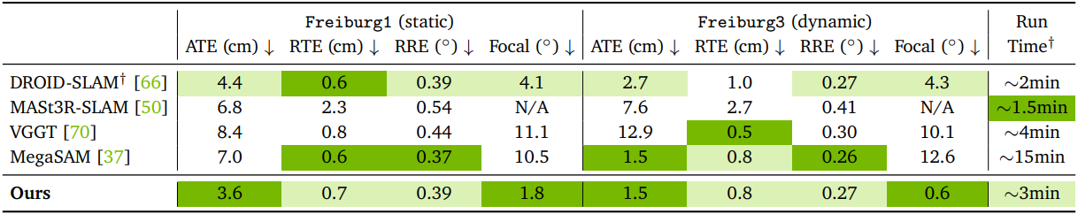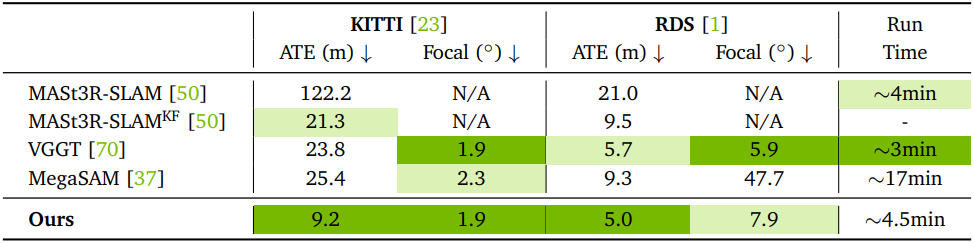 다음은 (위) TUM-RGBD 데이터셋과 (아래) 야외 운전 데이터셋에서의 포즈 및 intrinsic 정확도를 비교한 결과이다.