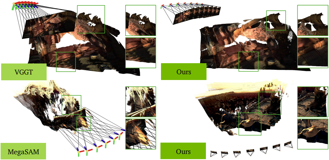 최근에는 대용량 데이터셋을 학습하여 이미지에서 카메라 포즈와 깊이를 직접 예측하는 end-to-end feed-forward 모델이 등장했다. 이러한 모델들은 뛰어난 robustness를 보여주지만, scalability에 한계가 있다. 긴 동영상 처리는 GPU 메모리 사용량이 많아 처리가 어려운 경우가 많아, 동영상 프레임을 서브샘플링하거나 짧고 분리된 청크를 처리하는 방법을 사용해야 한다. 최근 유망한 추세는 MASt3R와 같은 강력한 학습된 프런트엔드를 기존 SLAM 백엔드에 통합하여 SLAM과 feed-forward 방식을 혼합한 하이브리드 방식을 모색하는 것이다. 그러나 단순히 프런트엔드를 교체하는 것만으로는 실제로 충분하지 않은 경우가 많다.