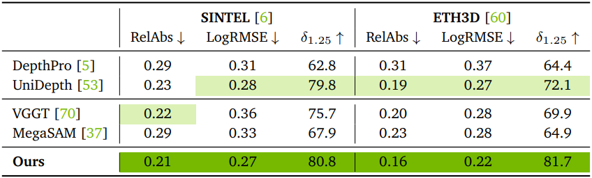 \[\begin{equation} e_\textrm{depth} (\textbf{D}_i) = \sum_{\textbf{u}} m[\textbf{u}] \cdot \| \textbf{D}_i [\textbf{u}] - \textbf{D}_i^\textrm{prior} [\textbf{u}] \|^2 \end{equation}\](\(\textbf{D}_i^\textrm{prior}\)는 사전 학습된 monocular metric depth estimation 네트워크에서 추정된 depth map, $m$은 깊이 불확실성)
