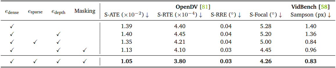 \[\begin{equation} e_\textrm{ViPE} (\{\textbf{T}_i\}, \{\textbf{D}_i\}, \textbf{k}) = \sum_{(i, j) \in \mathcal{E}} e_\textrm{dense} (\textbf{T}_i, \textbf{T}_j, \textbf{D}_i, \textbf{k}) + \sum_{(i, j) \in \mathcal{E}} e_\textrm{sparse} (\textbf{T}_i, \textbf{T}_j, \textbf{D}_i, \textbf{k}) + \sum_{i \in \mathcal{V}} e_\textrm{depth} (\textbf{D}_i) \end{equation}\]여기서 \(e_\textrm{dense}\)는 두 프레임 사이의 dense matching을 활용하는 항, \(e_\textrm{sparse}\)는 sparse keypoint matching 정보를 활용하는 항, \(e_\textrm{depth}\)는 포즈 추정의 일관성과 robustness를 보장하기 위한 깊이 정규화 항이다. 에너지 함수 \(e_\textrm{ViPE}\)는 Gauss-Newton solver를 사용하여 최소화되며, 선형 시스템은 본질적으로 sparse하므로 COLAMD reordering을 사용하는 factorized solver로 효율적으로 해결할 수 있다.