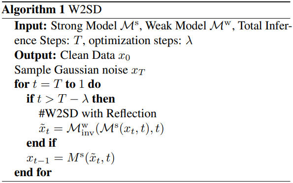 Algorithm 1에 설명된 바와 같이 reflection 연산자 \(\mathcal{M}_\textrm{inv}^w (\mathcal{M}^s (\cdot))\)를 사용하여 샘플링 궤적을 최적화할 수 있다. 강력한 모델의 denoising과 약한 모델의 inversion을 반복적으로 통합함으로써 샘플링 과정에서 step별 reflective process를 수행하고, latent $x_t$를 개선된 \(\hat{x}_t\)로 정제한다.