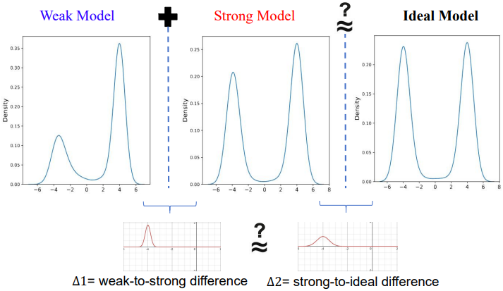 약한 모델과 강한 모델의 분포 차이를 \(\Delta_1 = \nabla \log p^s - \nabla \log p^w\)로, 강한 모델의 분포와 이상적인 분포의 차이를 \(\Delta_2 = \nabla \log p^\textrm{gt} - \nabla \log p^s\)로 정의하자. 추정 가능한 \(\Delta_1\)을 이용하여 \(\Delta_2\)를 근사함으로써 기존 diffusion model과 이상적인 모델 간의 격차를 간접적으로 줄여 학습된 분포를 실제 데이터 분포에 더 가깝게 만든다.