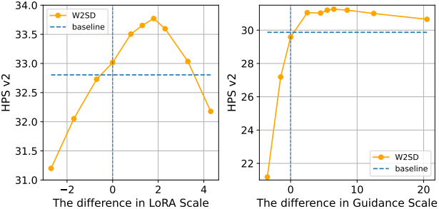 다음은 LoRA scale과 guidance scale에 따른 W2SD의 성능을 비교한 결과이다.