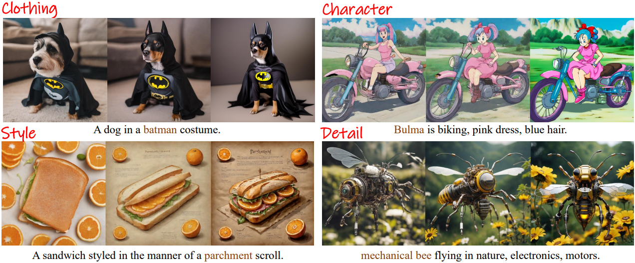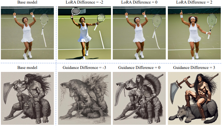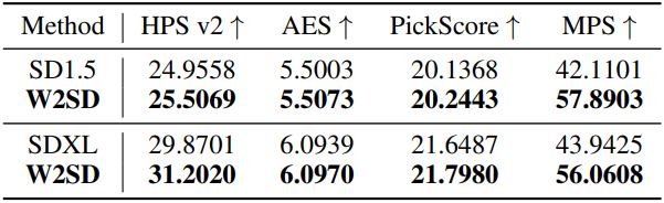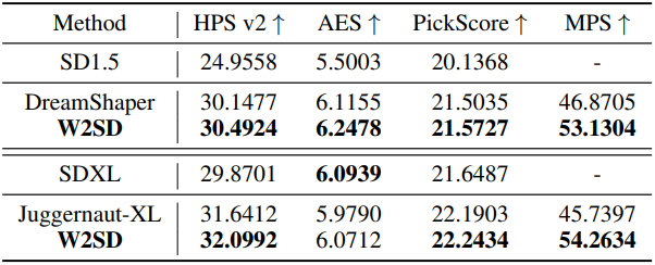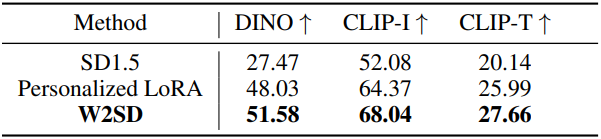 다음은 LoRA fine-tuning에 대한 결과이다. SD1.5를 약한 모델로, SD1.5를 LoRA fine-tuning한 모델을 강한 모델로 하였다. (왼쪽부터 약한 모델, 강한 모델, W2SD)