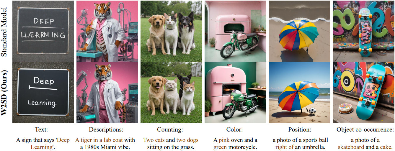 본 논문에서는 강한 모델과 약한 모델 사이의 차이를 이용하여 이상적인 모델과 강한 모델 사이의 차이를 경험적으로 해소할 수 있음을 보여준다. 그리고 약한 차이와 강한 차이를 이용하여 강한 차이와 이상적인 차이를 연결하는 새로운 프레임워크인 Weak-to-Strong Diffusion (W2SD)을 제안하였다. 약한 차이와 강한 차이를 기반으로 denoising과 inversion 연산을 번갈아 수행하는 reflective 연산을 통합함으로써, W2SD가 latent를 샘플링 궤적을 따라 가이드하여 실제 데이터 분포 영역으로 효과적으로 이끌 수 있다.