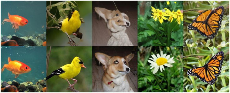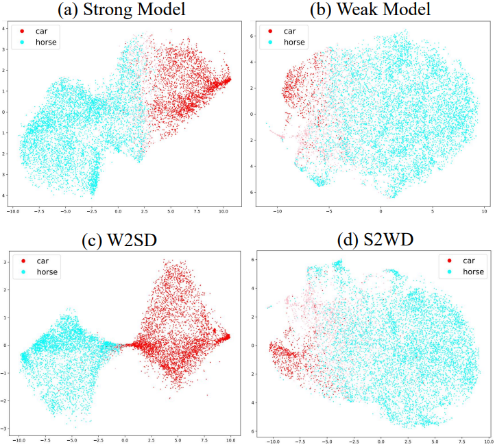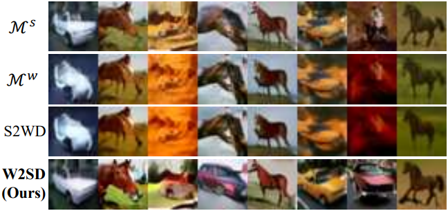 다음은 CIFAR-10의 실제 이미지에 실험 결과이다. \(\mathcal{M}^s\)는 말 5,000장, 차 2,500장으로 학습되었으며, \(\mathcal{M}^s\)는 말 5,000장, 차 500장으로 학습되었다. 위는 t-SNE로 CLIP feature의 차원을 줄여 나타낸 것이고, 아래는 샘플링 예시들이다.