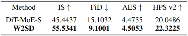 다음은 MoE에 대한 결과이다. DiT-MoE-S를 강한 모델로 사용하고, 각 denoising step에서 가장 성능이 낮은 두 expert를 약한 모델로 사용하였다. (위가 DiT-MoE-S, 아래가 W2SD)