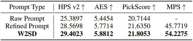 다음은 프롬프트에 대한 결과이다. GenEval의 텍스트 프롬프트 (5~6 단어)를 약한 모델에 사용하고, LLM으로 정제한 프롬프트를 강한 모델에 사용하였다. (모델: SDXL, 데이터셋: GenEval)
