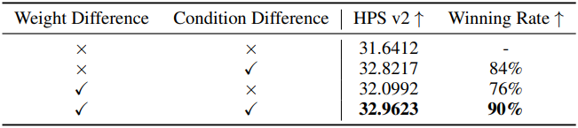 다음은 classifier-free guidance에 대한 결과이다. Guidance scale이 높은 모델을 강한 모델로, 낮은 모델을 약한 모델로 사용하였다. (모델: SDXL, 데이터셋: Pick-a-Pic)